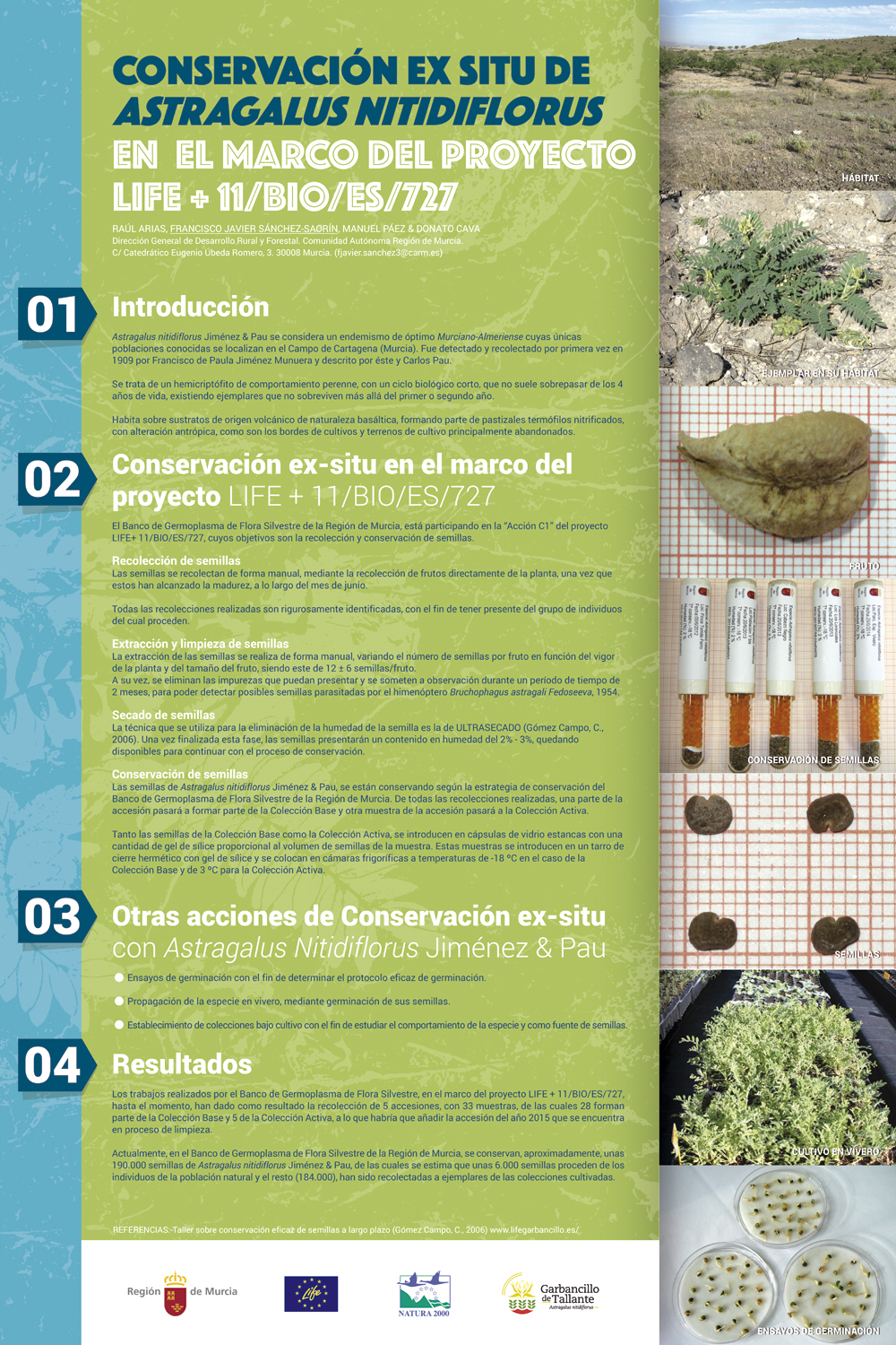 Poster con información general sobre el Proyecto LIFE11 BIO/ES/727 de Conservación de Astragalus nitidiflorus: características de la especie, localización, objetivos del proyecto, etc., tomando especial interés en los trabajos de investigación y conservación desarrollados desde la Estación Experimental Agroalimentaria “Tomás Ferro” de la UPCT.